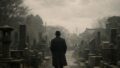曇り空の墓地の小道を一人歩く男性の後ろ姿
